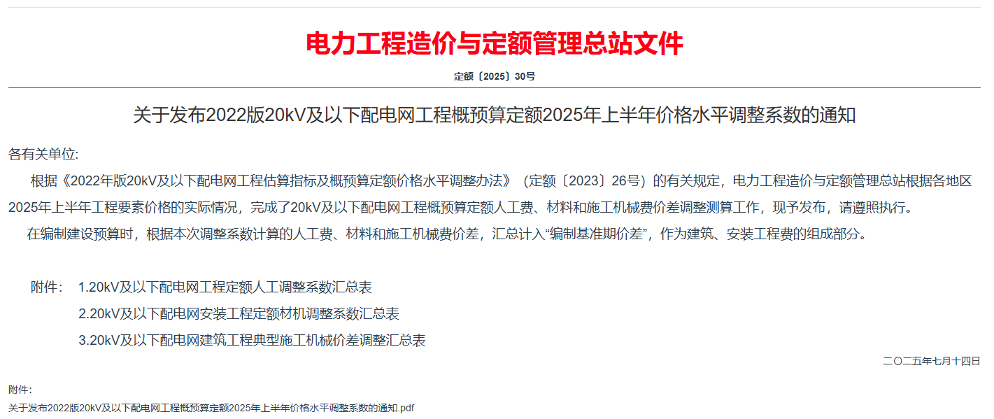 电力工程造价与定额管理总站文件 定额〔2025〕30号 关于发布2022版20kV及以下配电网工程概预算定额2025年上半年价格水平调整系数的通知