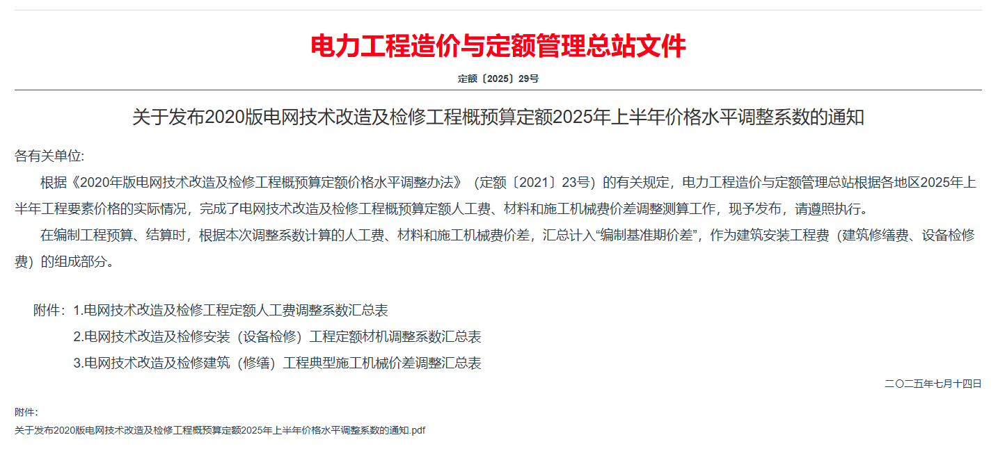 电力工程造价与定额管理总站文件 定额〔2025〕29号 关于发布2020版电网技术改造及检修工程概预算定额2025年上半年价格水平调整系数的通知